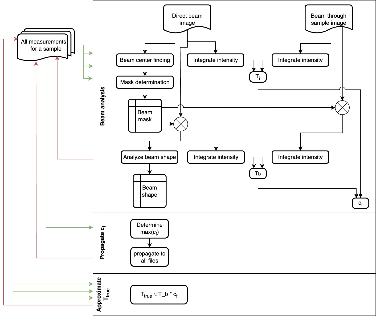 At the same time, we’re determining the transmission factor based on the whole image. At the closest distances (0.1m), comparing this image-based transmission with the beam transmission gives us a correction factor to compensate for the scattered and diffracted photons. The largest of these correction factors should then apply to all the measurements of that sample since the scattering probability does not change (but at larger s-d distances where our detector area subtends a smaller solid angle, we’re just detecting less of it). In practice, we do the following steps (see also Figure 1):