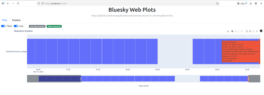 As for the previously mentioned issues, issue number 1 is now resolved (assuming the queue policy is set correctly): if a plan fails, this is recorded in the document stream sent to Tiled, and it just continues with the next one in the queue. I’ve a basic timeline viewer under casual development that shows me how the queue is progressing (Figure 2), and any issues with a plan will be highlighted in a different colour.