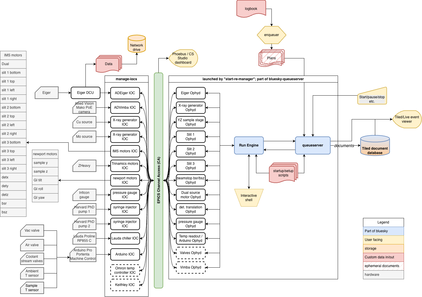 In general, we have two places where the user actively can control the instrument: either using the logbook with enqueuer (the standard way of using the instrument), or by using the interactive shell for near-infinite flexibility. When the queue is paused, the interactive shell can be used and vice versa.