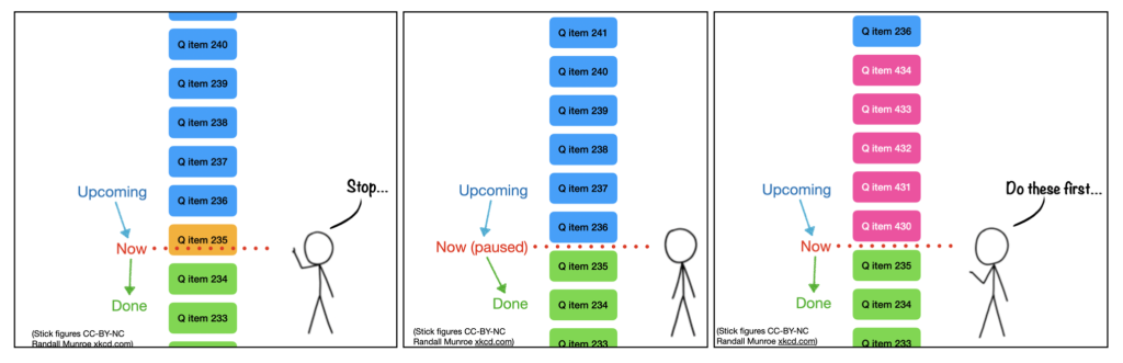 So in practice, we got some time-sensitive samples, stopped the queue, opened the instrument vacuum chamber to insert the samples, evacuated and enqueued the time-sensitive samples with priority. Additional background measurements were then placed at the end of the queue (i.e. without priority) and the queue was unpaused again.